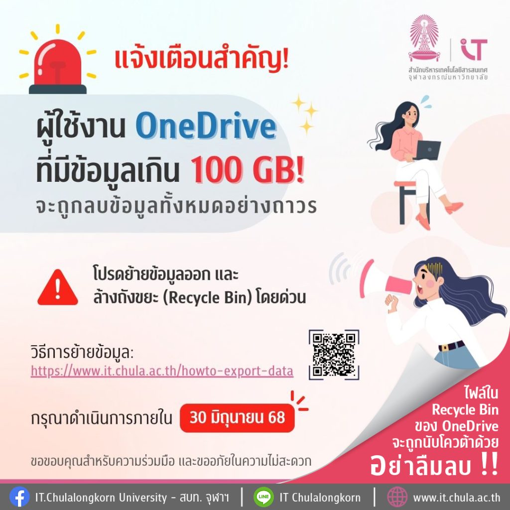 หากข้อมูลบน OneDrive เกินพื้นที่โควตา และพ้นระยะเวลาที่กำหนด ส่งผลให้ไม่สามารถเข้าถึงข้อมูลได้ โปรดติดต่อเจ้าหน้าที่เพื่อเปิดการเข้าถึง และโปรดดำเนินการลบ ย้าย ข้อมูลไปยังแหล่งอื่น พร้อมกับลบข้อมูลใน Recycle Bin ของ OneDrive เพื่อให้ได้พื้นที่ว่างกลับคืนมา