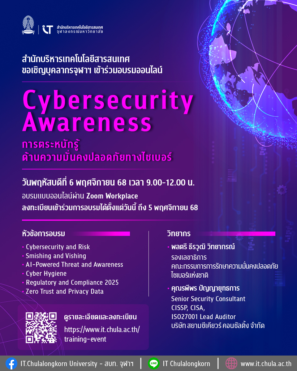 🚀 ก้าวทันภัยไซเบอร์ยุคใหม่! ขอเชิญบุคลากรจุฬาฯ อบรมออนไลน์ Cybersecurity Awareness