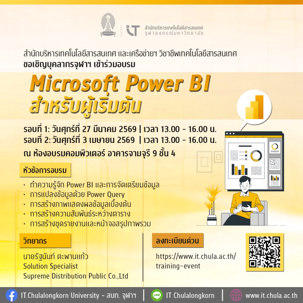สำนักบริหารเทคโนโลยีสารสนเทศ ขอเชิญชวนบุคลากรจุฬาฯ ทุกท่าน มาเริ่มต้นเรียนรู้การใช้งาน Microsoft Power BI ตั้งแต่พื้นฐาน จนสร้างรายงานสรุปภาพรวมได้ด้วยตัวเอง